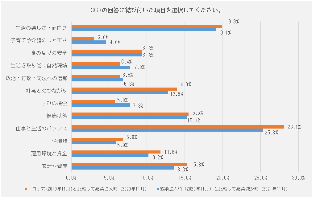 Q3.コロナ前(2019年11月)~感染拡大時(2020年11月)、感染拡大時(2020年11月)~感染減少時(2021年11月)の、「人生における幸福度(Wellbeing)」はどのように変化しましたか?