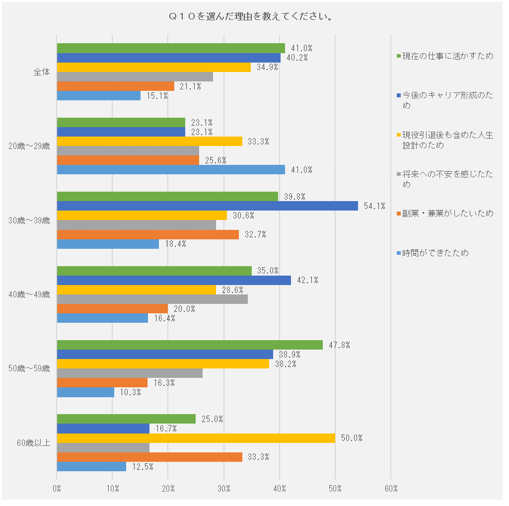 | ・ニューノーマルな時代を迎えるにあたり、「現在の仕事に活かすため」と同水準で「今後のキャリア形成のため」に新たなスキル・知識を身につけたい方がいることがわかりました。 ・20代は「時間ができたため」、30代・40代は「今後のキャリア形成のため」、50代は「現在の仕事へ活かすため」、60代は「現役引退後も含めた人生設計のため」が最も多く選ばれています。 ・昨今注目が集まる「副業・兼業」については、60代が全世代で最も重視しており、「人生100年時代」の考え方の浸透がうかがえます。 |