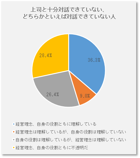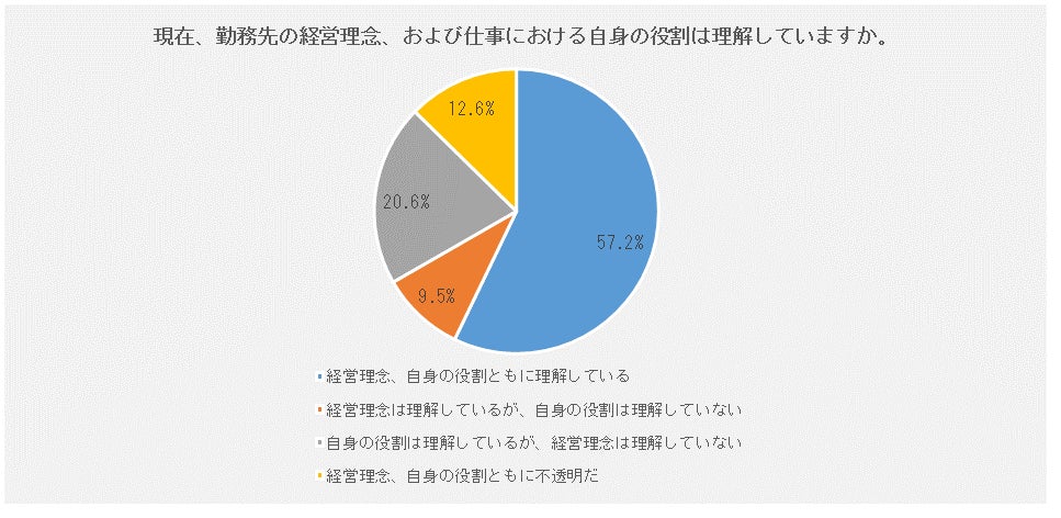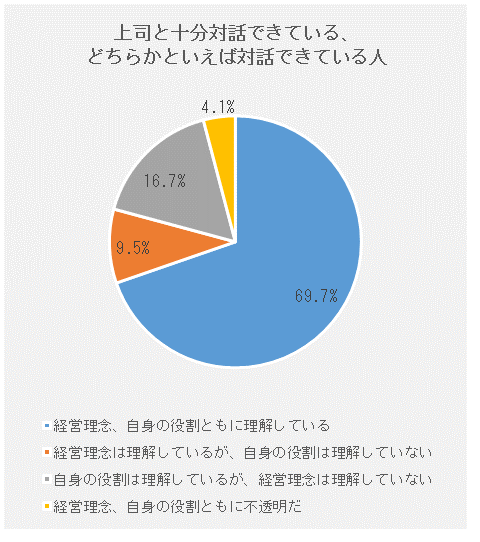 | ・約6割の方が「勤務先の経営理念、自身の役割とも理解している」ことがわかりました。 ・上司との対話ができている人ほど、勤務先の経営理念、自身の役割とも理解しており、対話ができていないと経営理念、自身の役割とも理解が進みづらい傾向にあるため、上司との対話の重要性がうかがえます。 |