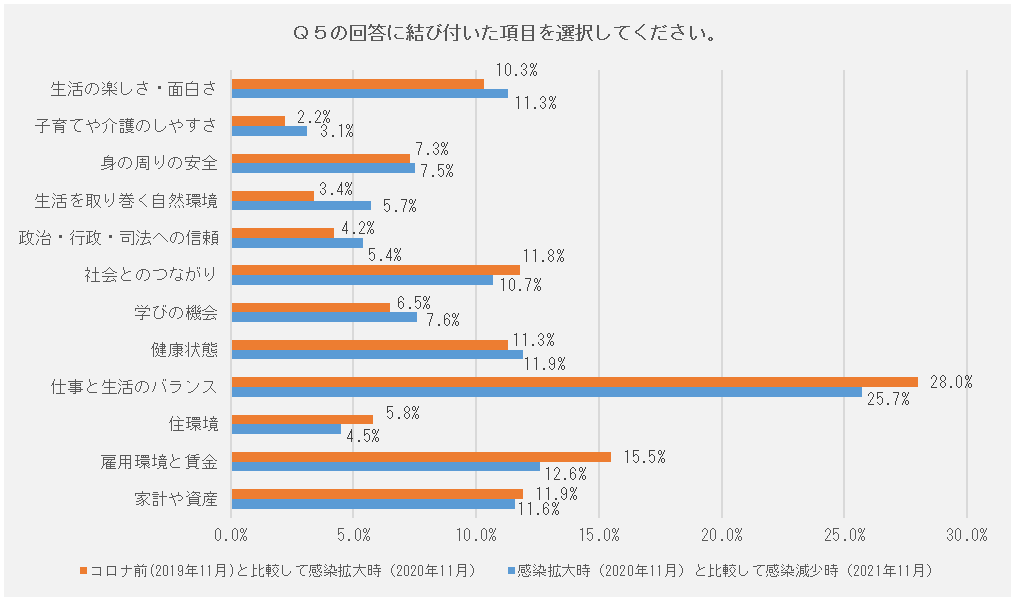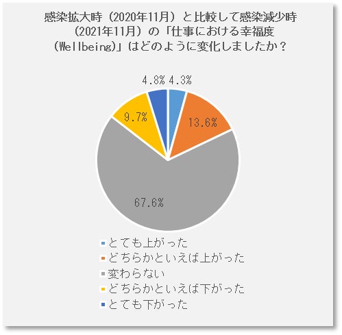Q5.コロナ前(2019年11月)~感染拡大時(2020年11月)、感染拡大時(2020年11月)~感染減少時(2021年11月)の、「仕事における幸福度(Wellbeing)」はどのように変化しましたか?