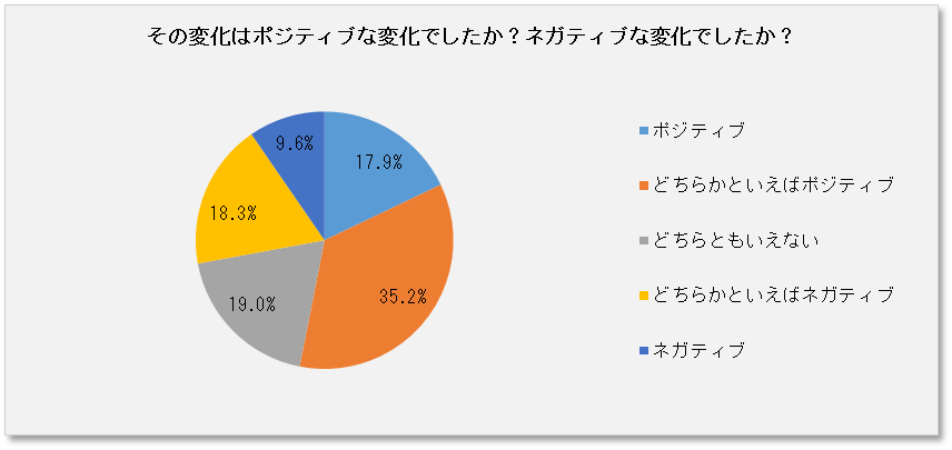| ・半数以上がポジティブな変化だと評価しており、コロナ禍がもたらしたものが必ずしもネガティブな面だけではないことがわかりました。 |