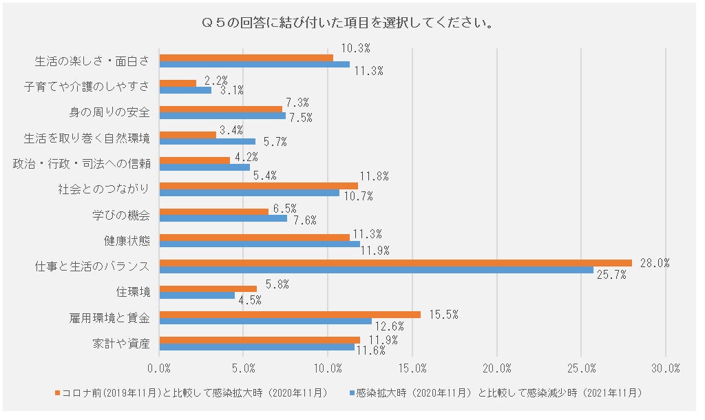 | ・いずれの時点でも「仕事と生活のバランス」、「生活の楽しさ」、「健康状態」、「家計や資産」、「社会とのつながり」が上位となっており、人生の幸福度の要因の軸となっていることがわかります。 ・相対的にみると「学びの機会」、「子育てや介護のしやすさ」が上昇しており、巣ごもりによる生活の変化がうかがえます。 |