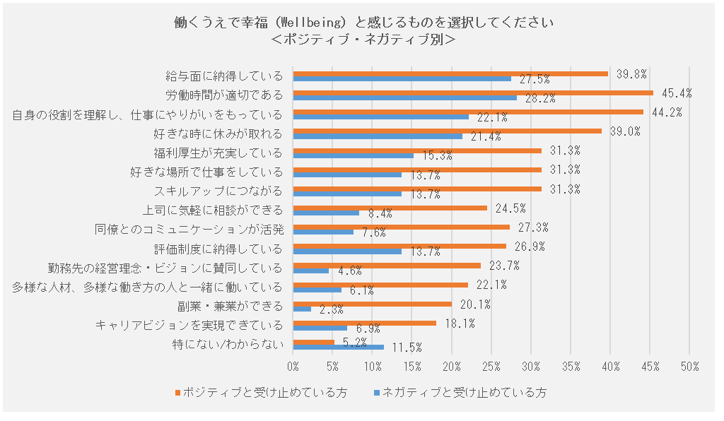 | ・「給与」、「労働時間」、「休み」といった待遇面・労働環境に関する項目が上位を占める中で、「自身の役割を理解し、仕事にやりがいをもっている」という内面的な要素も多く選ばれています。 ・5人に1人は「特にない/わからない」と回答しており、仕事を通じて幸福を感じてもらう取組み、従業員への働きかけが必要と考えられます。 ・Q2において、コロナ禍で仕事に対する価値観・考え方・向き合い方の変化をポジティブと捉えている方のほうが多くの項目で幸福(Wellbeing)を感じ、ネガティブと捉えている方のほうが選択する項目が少ない、「特にない/わからない」を選択する傾向にあることがわかりました。 |