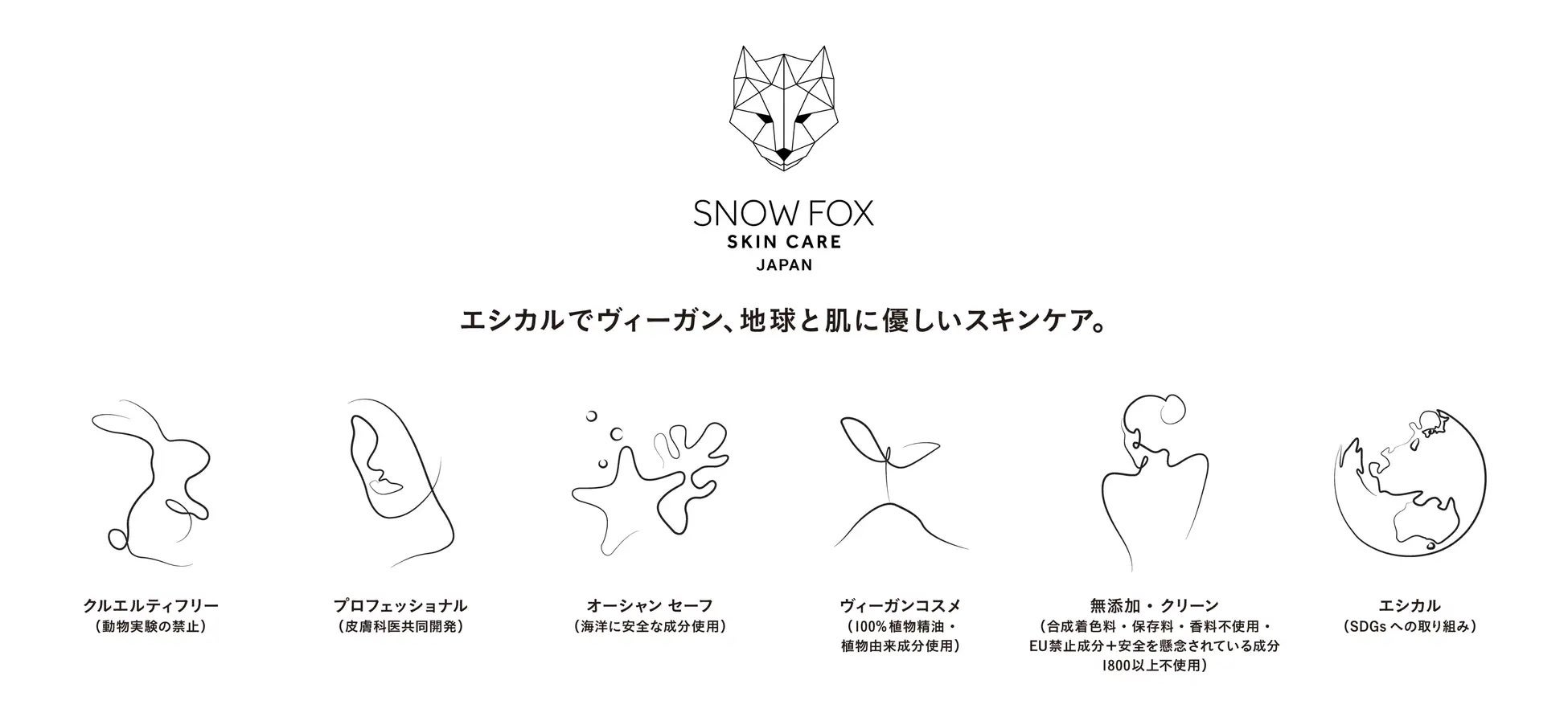 SNOW FOX SKINCAREは、不治の皮膚疾患「酒さ」に長年苦しんできたフィービが、自身と同様に肌あれや皮膚疾患に悩む方々に向けて商品を提供してきたブランドです。ヴィーガンであり、徹底した無添加の製品を展開しており、世界16カ国で販売されています。2016年にオーストラリアで発売されてから今日まで、地球第一主義を掲げており、ヴィーガンや地球環境保全、クルエルティフリー、クリーン(無添加)、プロフェッショナル、オーシャンセーフといった6つの哲学を大切にしています。私たちは、肌悩みを解決するために、これからも良い製品を開発し続け、多くの方々の肌悩みに寄り添いたいと考えています。