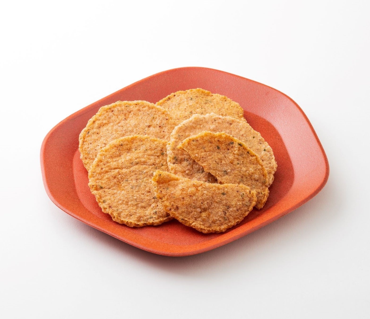 愛知に馴染みの深い海鮮素材「たこ」を使用し、天然海老を加えて旨みを際立たせました。愛知県産の青しそと小麦粉で風味を整え、一度焼きで旨みを凝縮、からりと揚げて軽やかに仕上げた坂角こだわりの贅沢煎餅です。