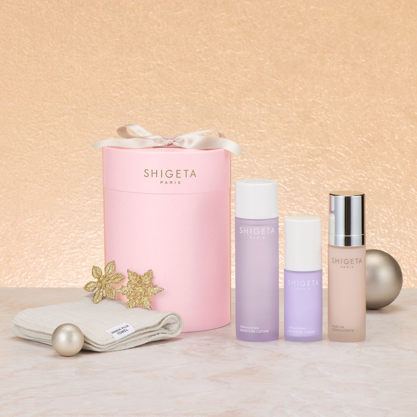 フレッシュなダマスクローズを使用した「アウェイクニング シリーズ」から、お肌にうるおいを与える化粧水「AWモイスチャーローション」、濃密なうるおいで満たすシアバターを高配合した保湿クリーム「AW モイスチャークリーム」の 2 種類と、うるおい不足の悩みのためにうまれた 2 種類のバイオヒアルロン酸が肌をうるおいのベールで包み込む、今秋に発売したばかりの美容液「デュアル HA コンセントレート」をセレクト。洗顔後のお肌を労わっていただくために、創業より 100 余年の歴史を持つ神藤タオルによる優しい肌ざわりのタオルもセットにしました。