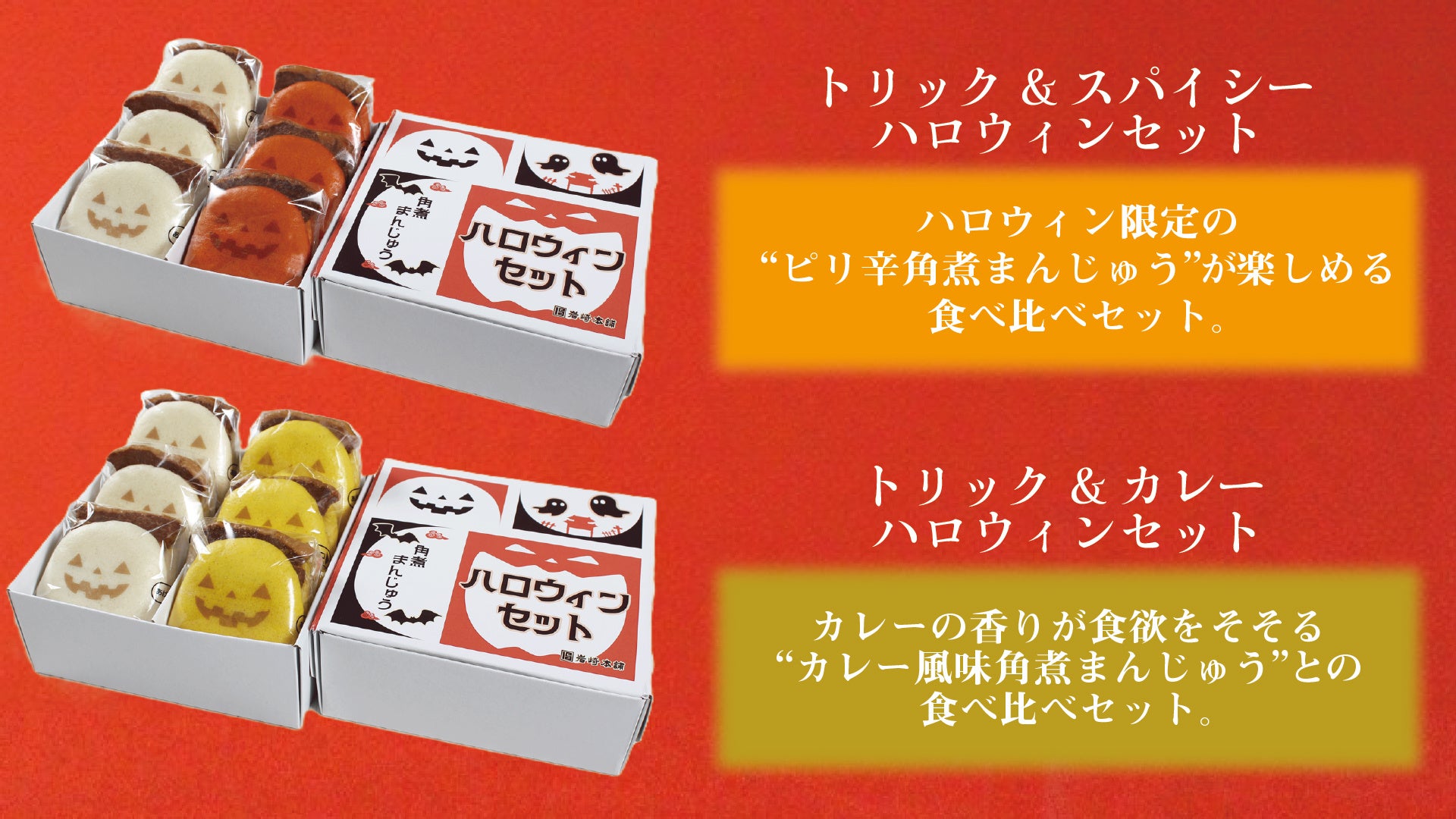 日々の疲れを癒すくつろぎ時間におすすめするのは、「ハロウィン角煮まんじゅう」「ハロウィンピリ辛角煮まんじゅう」。どちらも、ジャック・オー・ランタンのプリント印が施され、手にした瞬間から心が躍る可愛さです。とろける角煮は、ティータイムにも晩酌にも、シーンを選ばず楽しむことができます。