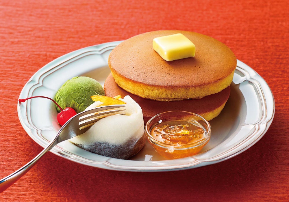 「もちっとクリーム大福とホットケーキ~柚子ソース添え~」は、専用の銅板で丁寧に焼き上げた『珈琲館』の看板メニュー”トラディショナル・ホットケーキ“に、あんこ、白玉、ホイップが入った店内仕込みの大福と抹茶アイスを添え、柚子ソースでいただくボリュームたっぷりの贅沢なホットケーキです。