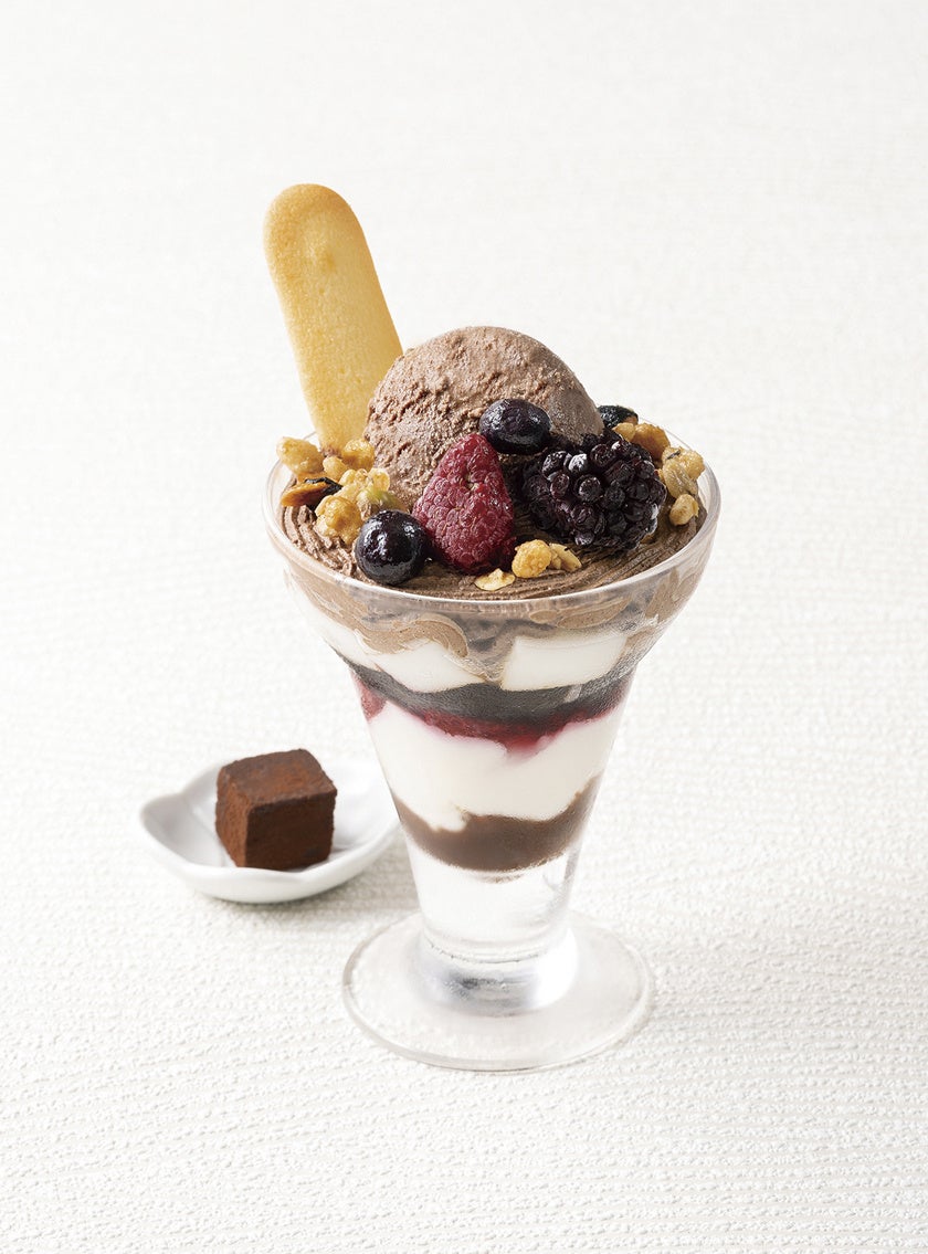 濃厚なチョコレートとベリーの酸味の相性が抜群のぱふぇ。梅の花で人気のデザートとチョコレートの絶妙な組み合わせをお楽しみいただけます。豆腐ショコラも添えております。