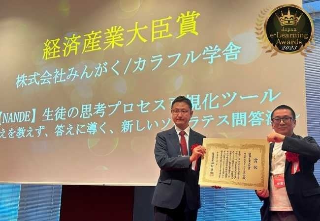 株式会社みんがくとカラフル学舎が共同開発した、生徒の思考プロセス可視化ツール「NANDE」が、eラーニングを活用したコンテンツ等の中から優れたものを選出するアワード「第20回 日本e-Learning大賞」にて、経済産業大臣賞を受賞し、11月1日に表彰式が開催されました。また、4th AES GLOBAL AWARDの「SILVER賞(銀賞)」、並びに第8回 IMS Japan賞の「奨励賞」も併せて受賞いたしました。既存のソクラテス問答法に着目し、AIツールで支援する点や、他の学習管理システム(LMS)や学習eポータルなどのプラットフォームに接続する計画が評価されました。