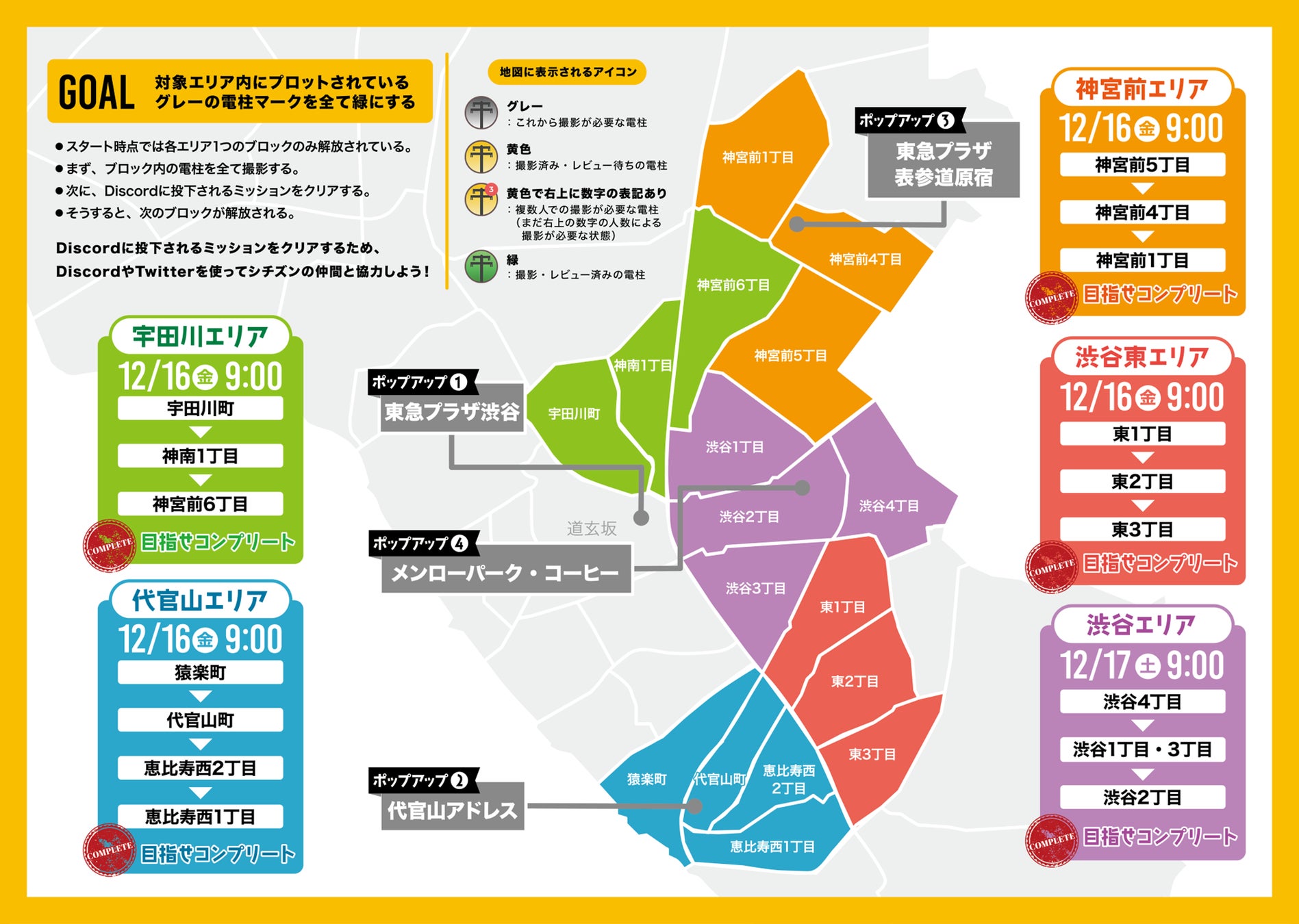 対象エリア内にプロットされている電柱を撮影しコンプリートを目指します。対象エリアを5ブロック(宇田川エリア、神宮前エリア、代官山エリア、渋谷東エリア、渋谷エリア)に分け、さらにそれぞれのブロックを3~4つのエリア(町丁目ごと)に分割。エリア内の一つの町丁目で電柱画像がコンプリートされたら次の町丁目を解放するためのミッションがDiscordで運営から発表されます。ミッションはユーザーが協力プレイすることで達成される仕組みとなっています。