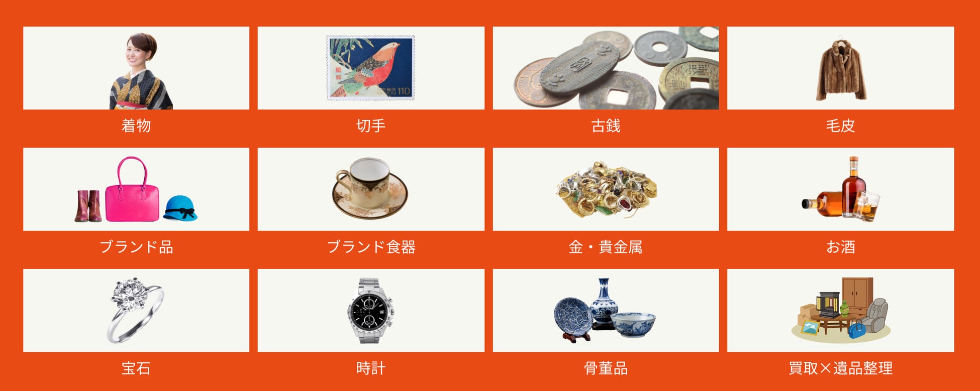 - 買取ジャンル:着物、ブランド品、ブランド食器、切手、毛皮、宝石(ジュエリー)、時計、お酒、骨董品、家具、家電など