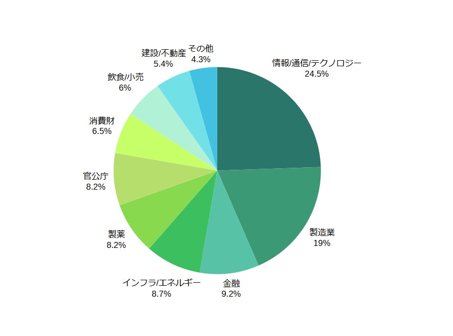 次いで「製造業」19%、「金融」9.2%、「インフラ/エネルギー」8.7%と続きました。