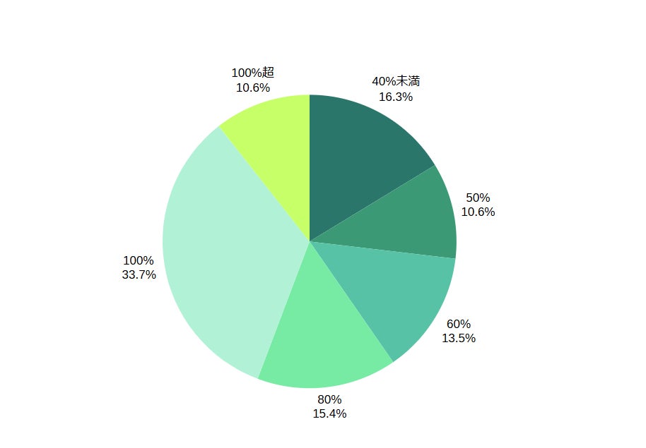 「40%未満」16.3%、「80%」15.4%、「60%」13.5%、「50%」10.6%となっており、副業として活動中の方は低稼働で本業とのバランスを保って稼働していることがわかりました。