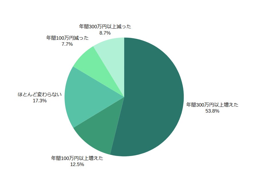 次いで「ほとんど変わらない」17.3%、「年間300万円減った」8.7%、「年間100万円減った」7.7%でした。
