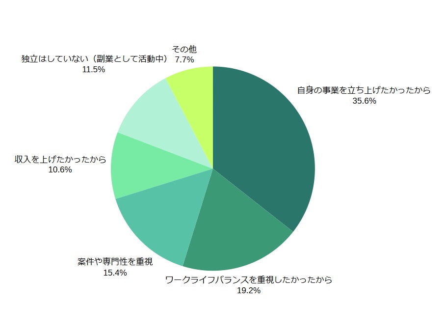 「Strategy Consultant Bank/IT Consultant Bank」に登録いただいているフリーコンサルを対象に「独立したきっかけ」についてのアンケートを行ったところ、「自身の事業を立ち上げたかったから」が最も多く35.6%でした。