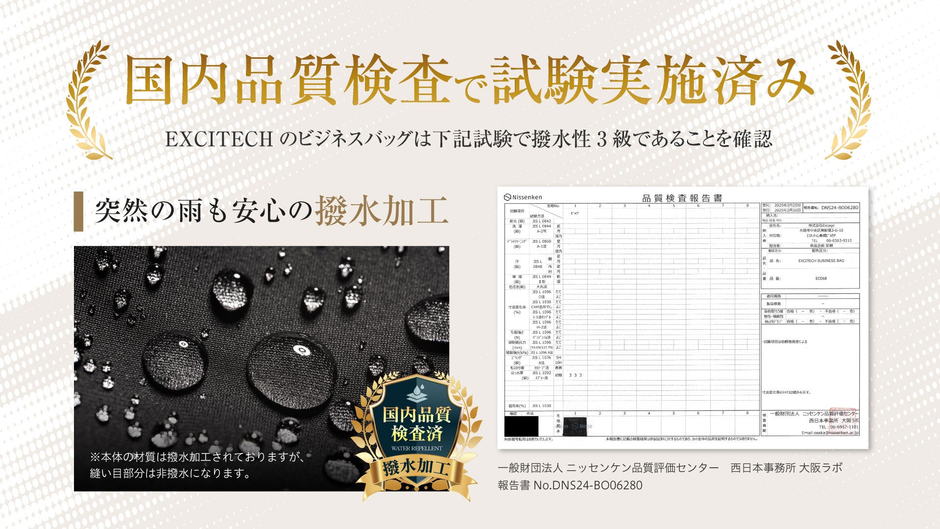 JIS規格(L 1092)準拠の撥水テスト済み素材を採用し、大切な荷物を守りやすい仕様に。日常使いでも安心感のある設計です。