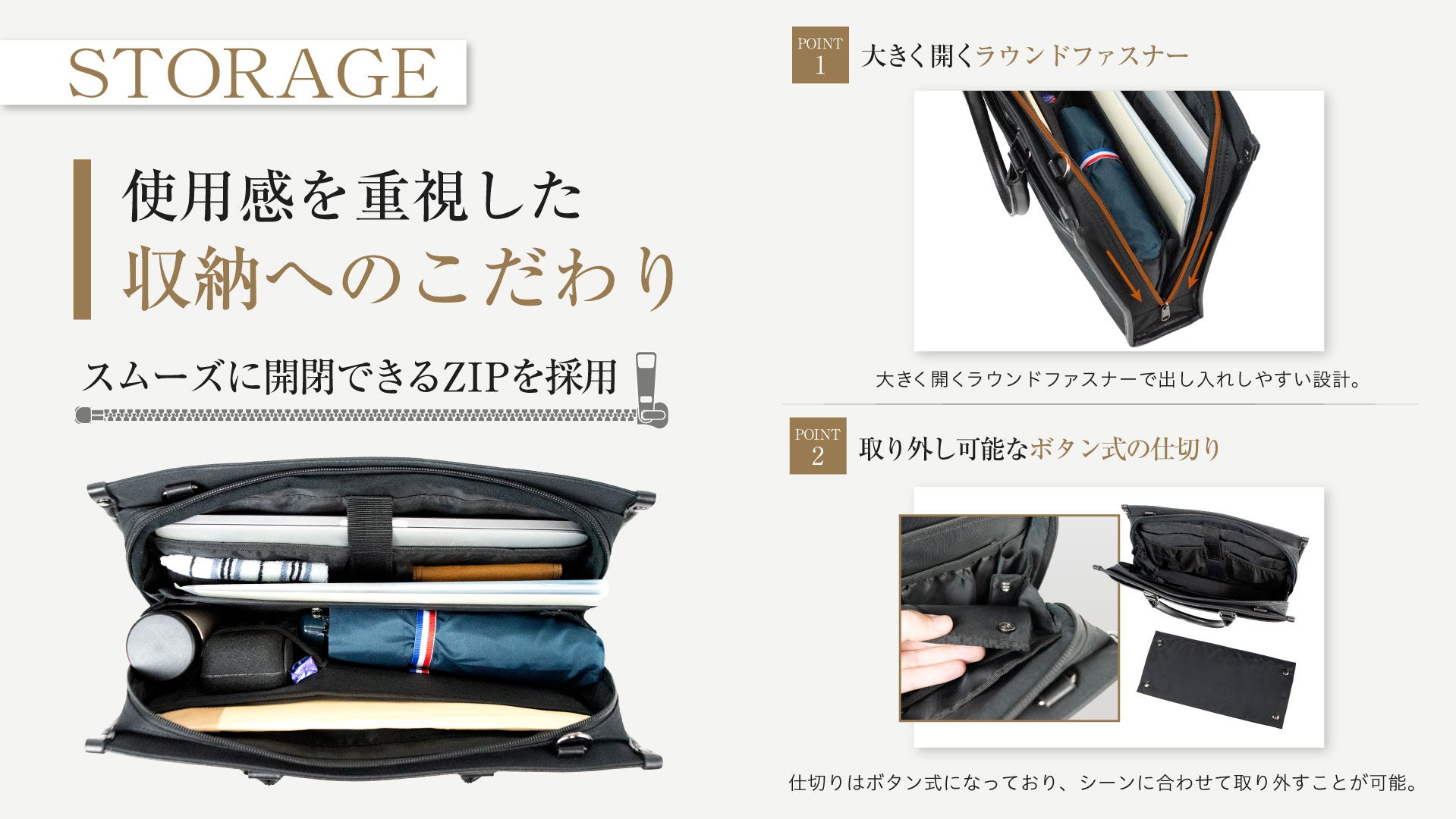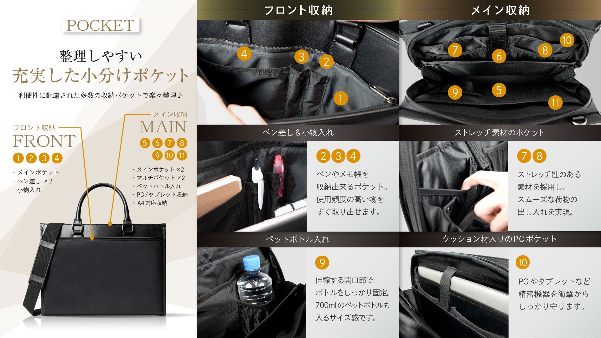 「ノートPCや資料、小物まで整理して持ち運びたい」という声に応え、計11の収納スペースを配置。ストレッチ性のあるポケットで出し入れをスムーズに行いやすく、中央のボタン式仕切りは取り外し可能。用途に応じて内部レイアウトを調整できます。