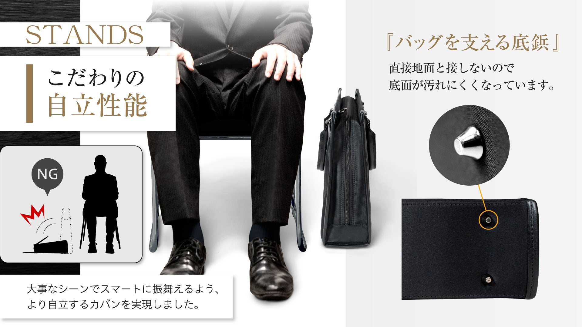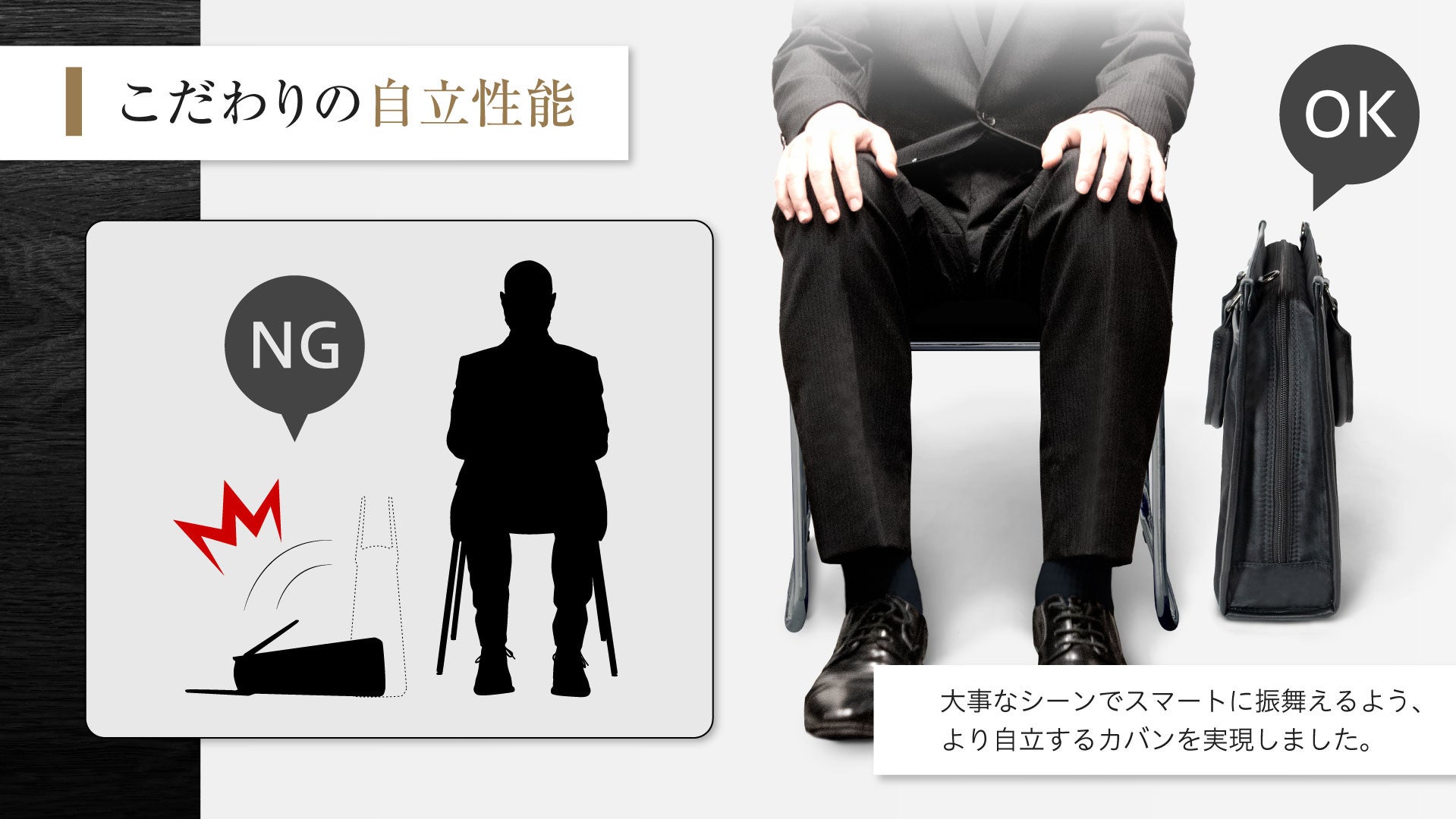 「安定感のあるバッグが欲しい」という声をもとに、荷物が多い日でも自立しやすい構造を採用。床や椅子の横に置いても形を保ちやすく、面接や商談の場でも所作を整えやすい設計です。