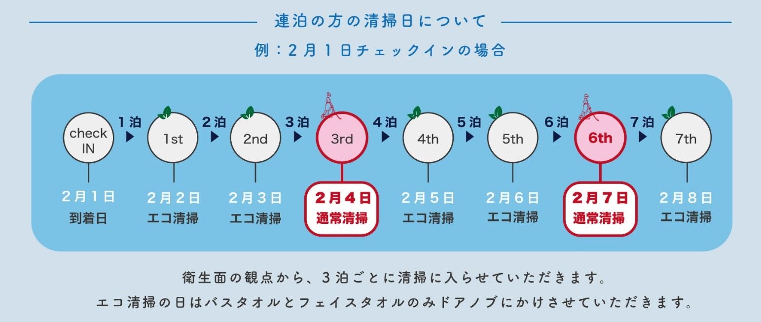 ご滞在中の客室清掃やベッドリネン、アメニティの追加補充などは行わず、タオル類のみ毎日客室のドアノブに新しいものをお届けします。(※2)