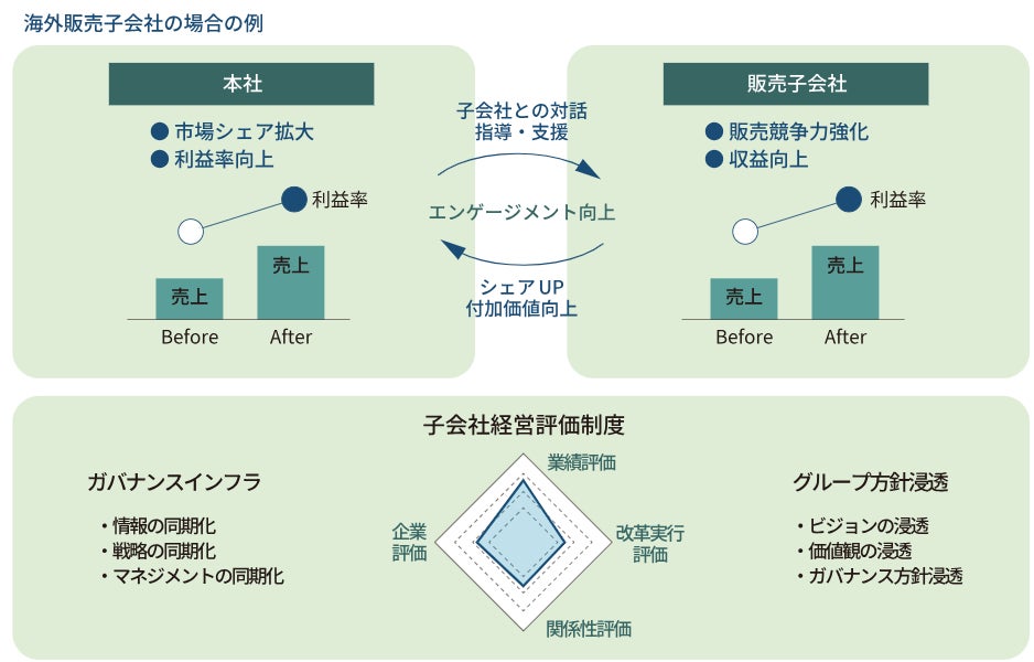 ●グループ子会社の現状認識(経緯・機能・位置づけ) ●トップマネジメントへのヒアリング、子会社主管部門役員 ●子会社の取締役会・経営会議へのオブザーブ参加による実態把握 ●子会社の評価基準の整備、評価実施(業績・エンゲージメント) |
