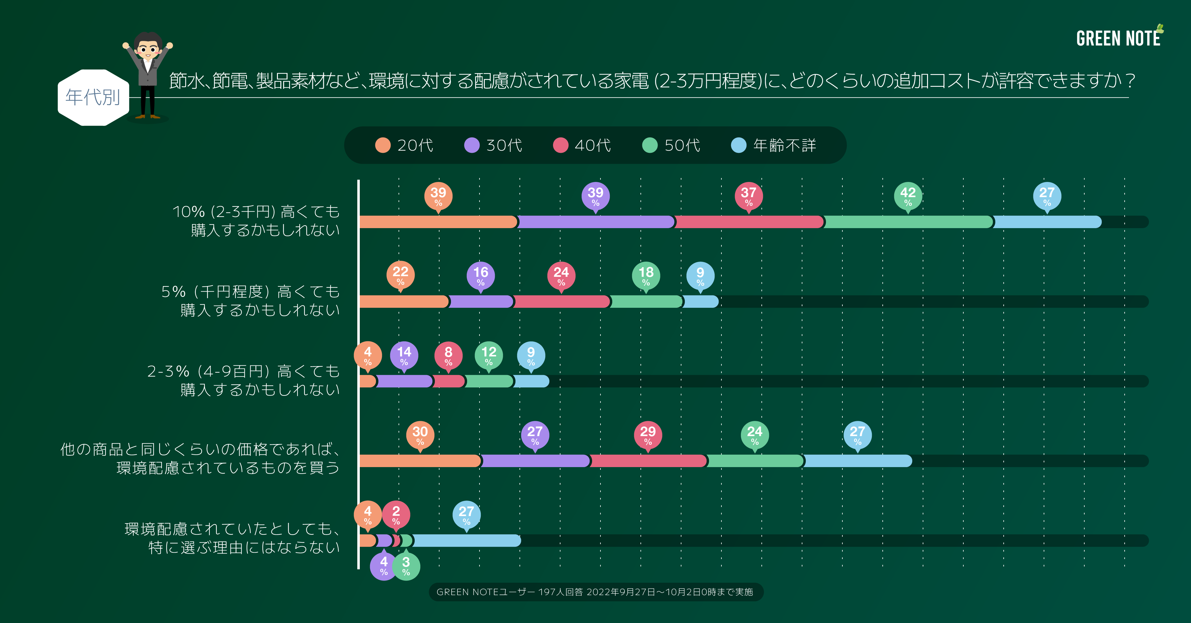 Greenroom株式会社(本社:東京都新宿区、代表取締役:山崎 修平)が運営するサステナビリティ / SDGs専門ニュースアプリ『GREEN NOTE(グリーンノート)』は、SDGsやサステナブルに関する意識を明らかにすることを目的に、サステナビリティに感度の高いアプリユーザー20~50代以上の197名を対象に「節水、節電、製品素材など、環境に対する配慮がされている家電の追加コスト」についての市場調査を実施。