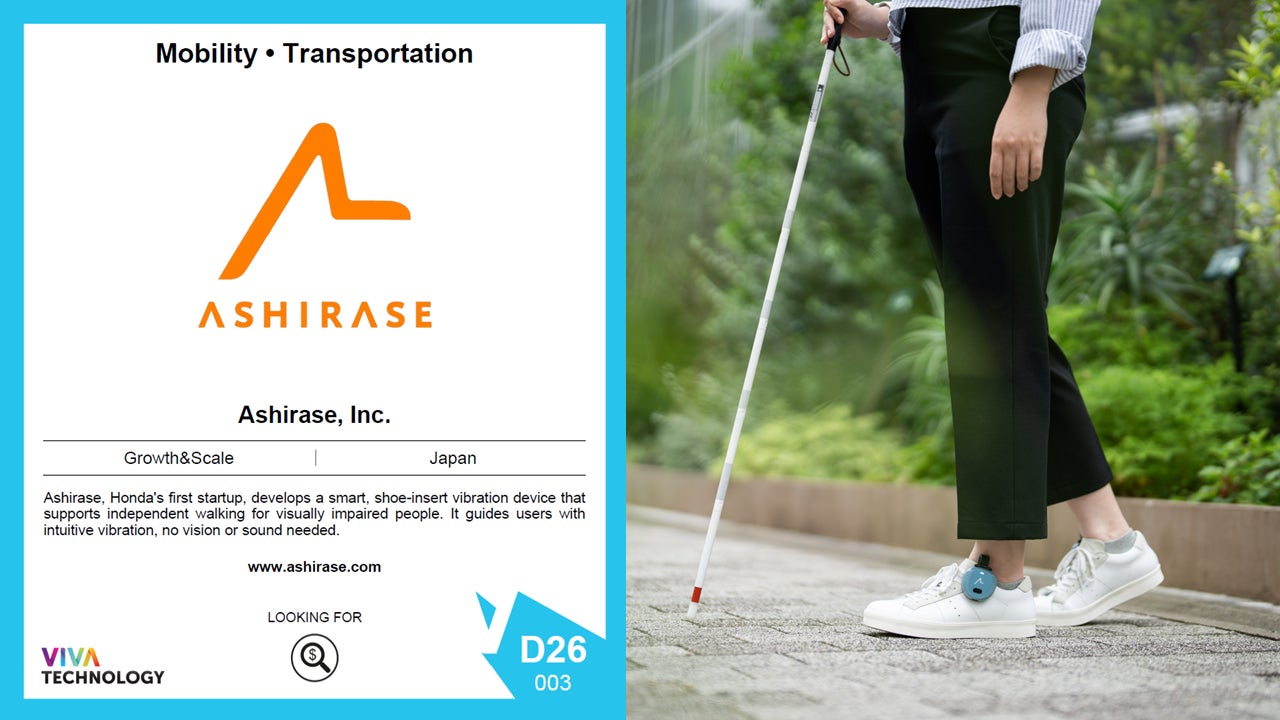 Ashiraseはこの場で、視覚障がい者の歩行をサポートするシューズ装着型の革新的なナビゲーションデバイスを展示します。Inclusive Mobility(誰もが移動できる社会)を実現する日本発の技術として、注目を集めています。
