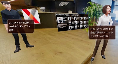 360度オフィス空間の中にアバターが登場し、オフィスツアー兼会社説明を行います。