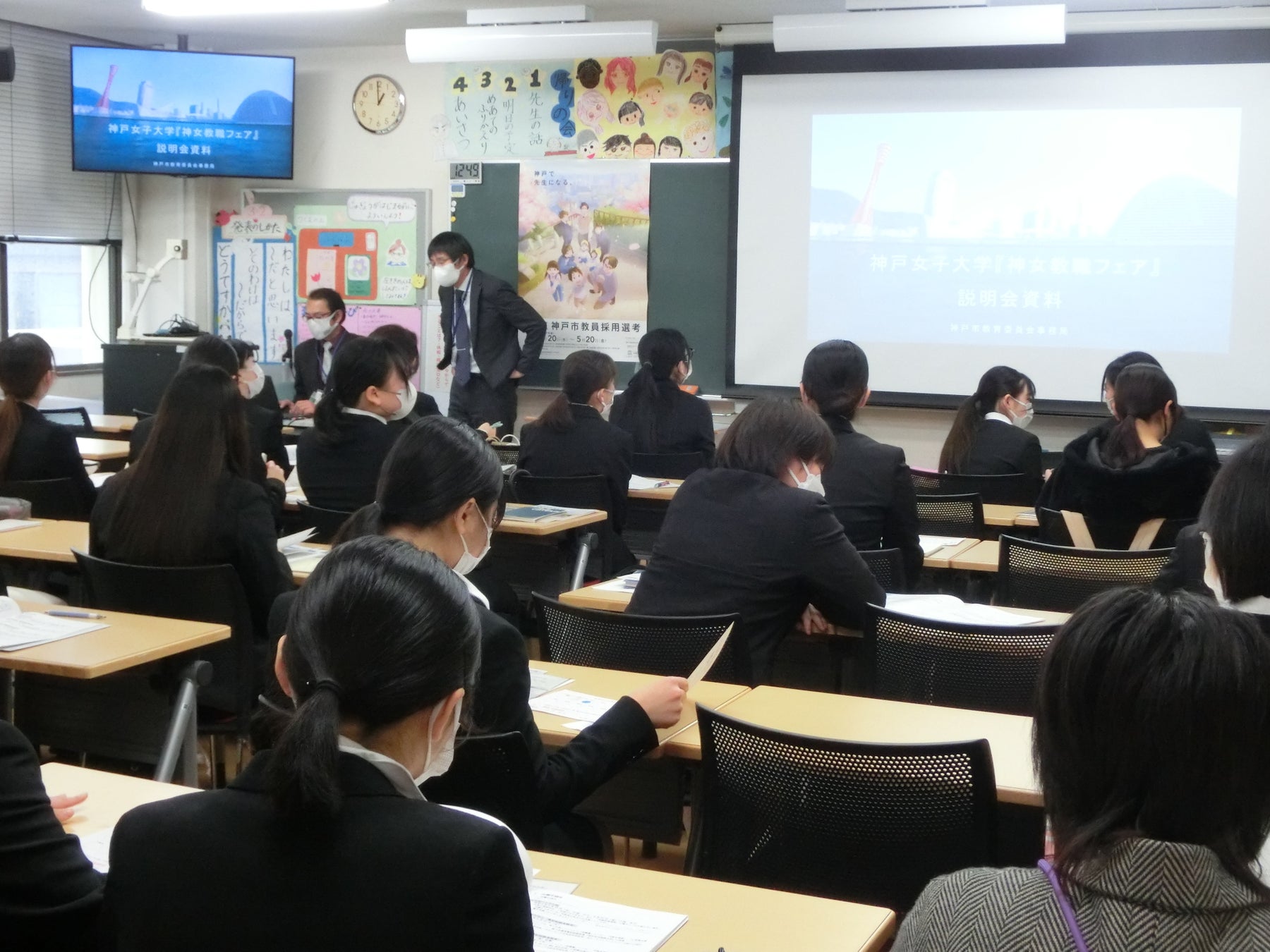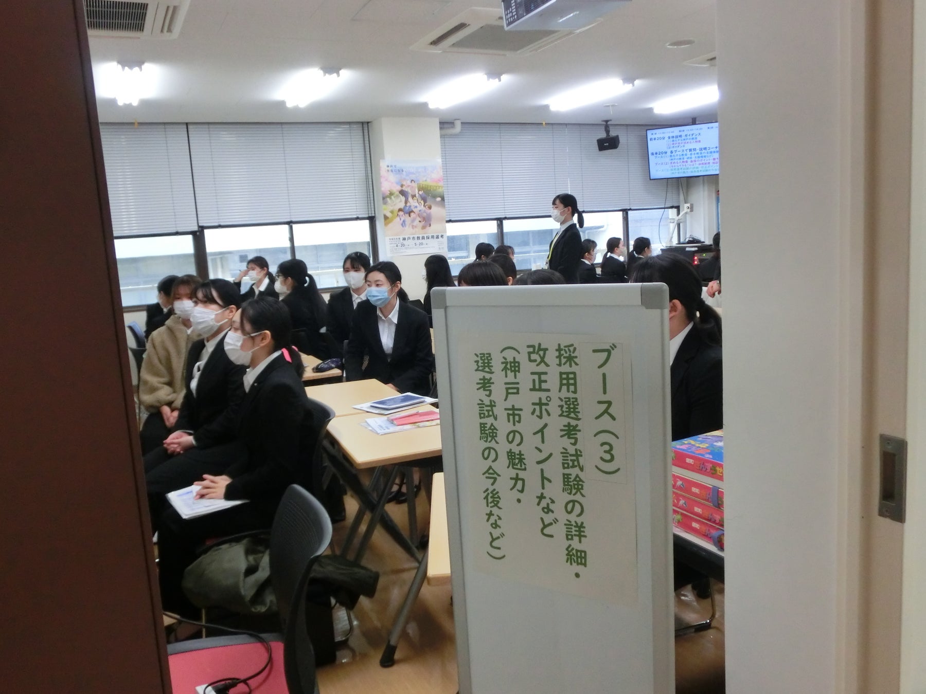 2024年2月9日(金)、 「教員版」合同就職説明会を神戸女子大学学内で行います。第2回目の今回は、小学校・中学校・高等学校・栄養教諭・養護教諭を目指す1年生~3年生だけではなく、保育士・幼稚園教諭を目指す1年生~3年生も対象に拡大します。全14自治体、11部局の採用人事の方々にご来校いただき、それぞれの教室で学生達に各県市の魅力ややりがい、仕事の内容や試験の様子まで詳しくお話をしてもらいます。また、各自治体教室のアテンドには、4月からその自治体で働く4回生が参加します。