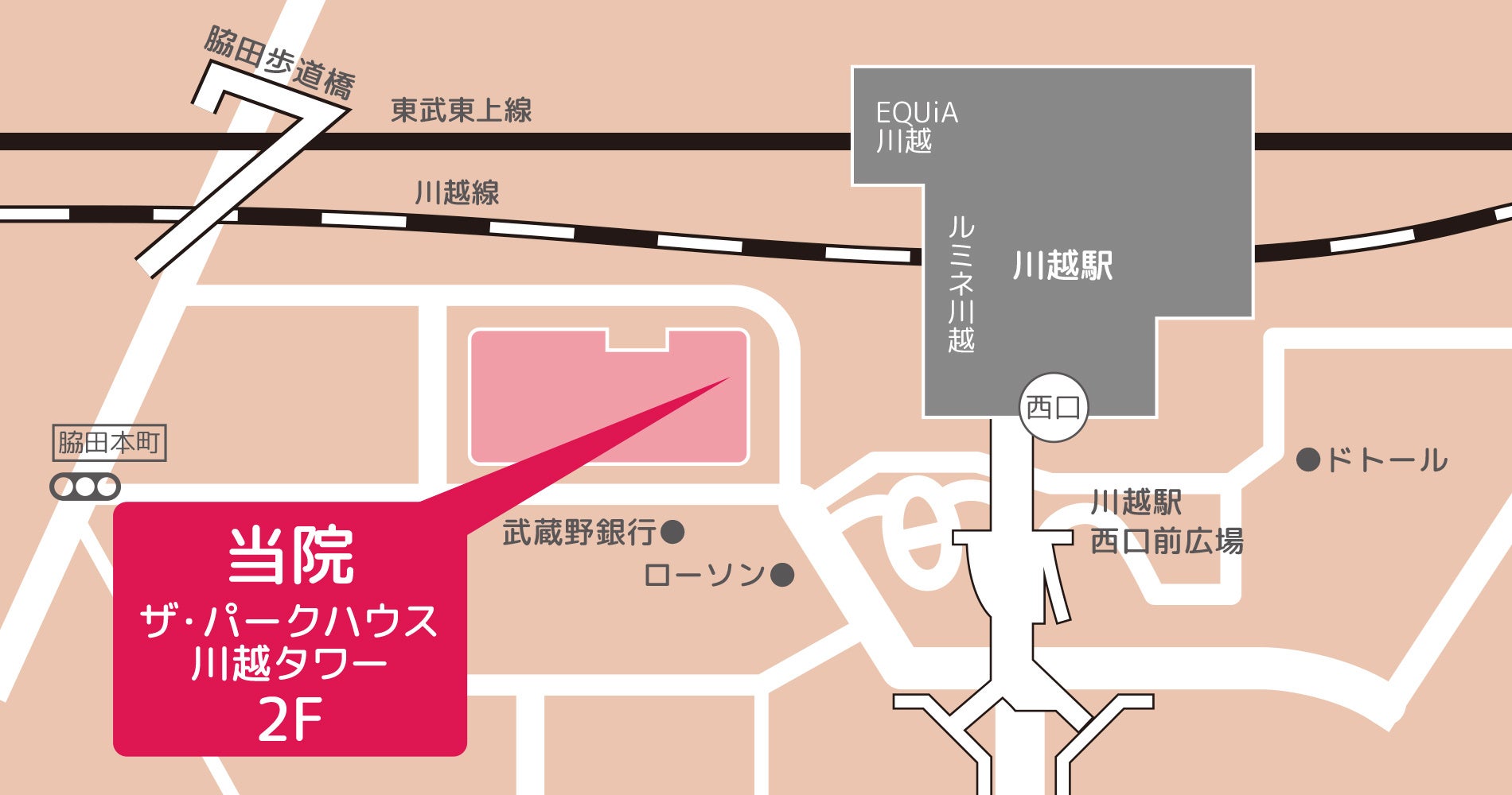東武東上線・JR川越線「川越」西口より徒歩約2分の「ザ・パークハウス川越タワー」2階で、朝9時から夜21時まで、土日祝日も毎日診療を行います。