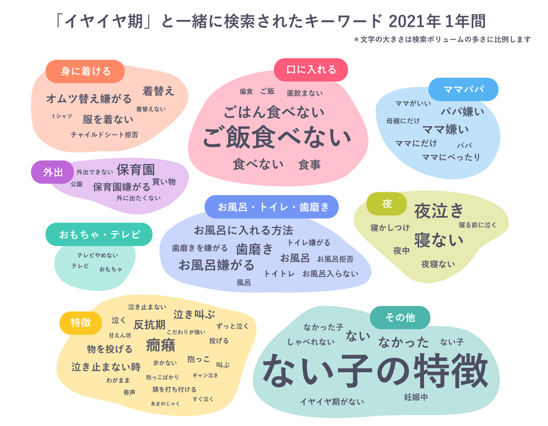 「イヤイヤ期」と一緒に検索されたワードを分類して並べてみると、ご飯、着替え、保育園、お風呂、歯磨き、寝る、など一日のほぼすべてのシーンが検索されていることがわかり、保護者の苦労が垣間見える結果となりました。一方で、「イヤイヤ期がない」という検索も多く見られ、「無ければ無いで不安…」という保護者の心理も見え隠れします。