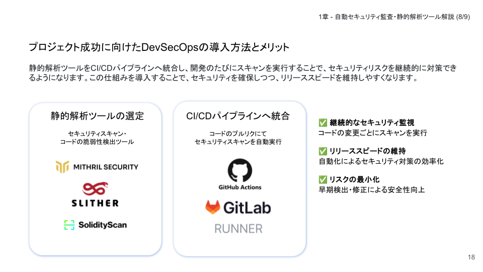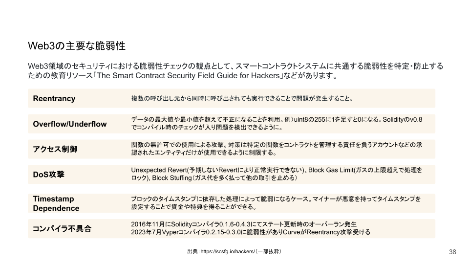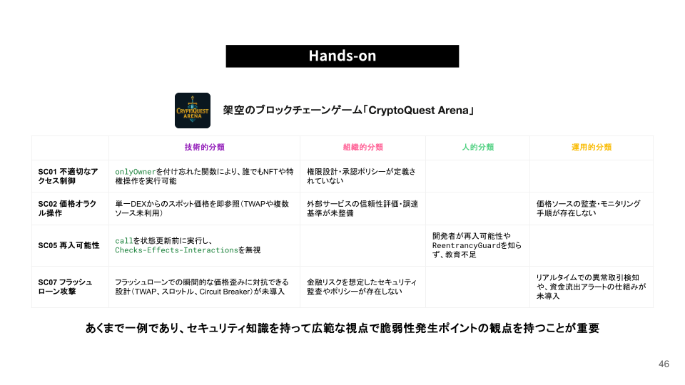 リエントランシー攻撃やクロスチェーン・フラッシュローン攻撃を中心に、代表的な脆弱性メカニズムを解説。実際のハッキング事例を題材に、発生原因と対策を分析しました。ハンズオンでは、架空ブロックチェーンゲームを題材に脆弱性の発生箇所を考察しました。