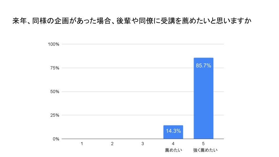 受講者アンケートでは、「来年も同様の企画があれば、後輩や同僚に薦めたいか」との問いに対し、85.7%が「強く勧めたい」、14.3%が「勧めたい」と回答しており、高い満足度が示されました。
