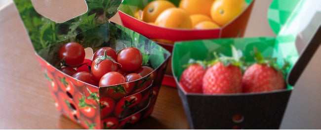昨年8月にリリースした、いちご用紙トレー「紙デリSTR21-15」を始め、蓋つきのミニトマト容器「紙ベジシリーズ」、「紙ベジトマト柄」と紙を使った青果物トレー、青果物容器をリリースしております。