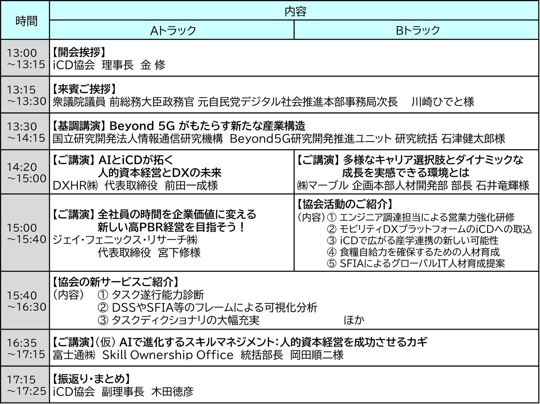 冒頭には衆議院議員 川崎ひでと様をお迎えし、Beyond 5G、AI×iCD、スキルマネジメント、高PBR経営など、次代の企業価値創造に直結する多彩な講演が並びます。