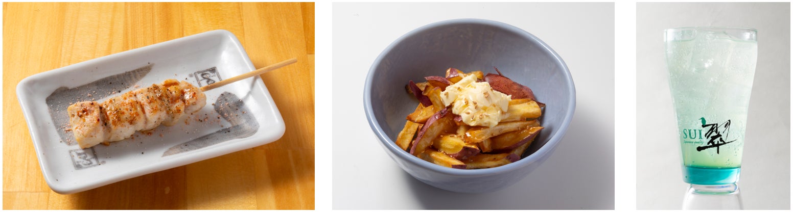 「むねスパイス」は、スモークドパプリカパウダーを加え、バージョンアップした「大吉特製 魔法パウダー」をかけて仕上げた焼鳥定番串の新メニュー。特製パウダーで、彩りとともにむね肉の旨みを引き出しました。「おさつスティック(はちみつ)」 は、素揚げしたさつまいもに「はちみつ」を加え、一品としてもデザートとしてもお楽しみいただけます。また、ドリンクメニューでは、人気上昇中の「翠ジンソーダ」にゆずシロップをプラスした「翠ジンゆずソーダ」をご用意しました。