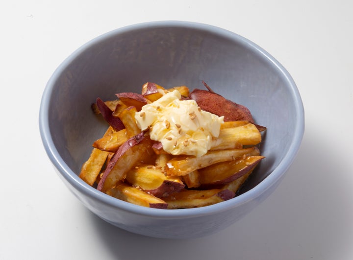 お客様の要望にこたえて開発したデザートメニュー。はちみつをかけ、人気メニュー「おさつスティック」を進化させました。
