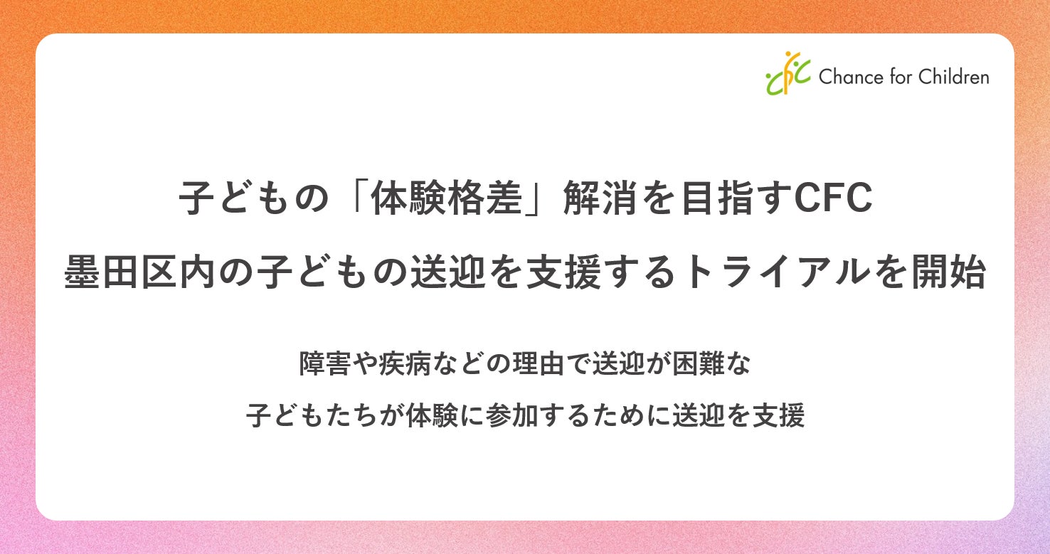 子どもの体験格差(※)の解消に取り組む公益社団法人チャンス・フォー・チルドレン(東京都墨田区、代表:今井悠介・奥野慧、以下CFC)は、ケアプロ株式会社(代表:川添高志、以下ケアプロ)と連携し、墨田区内の「ハロカル」の利用者のうち、子ども、またはその家族が障害や疾病などの理由で送迎が困難な場合において、送迎サービスの利用を支援するトライアルを開始いたします。