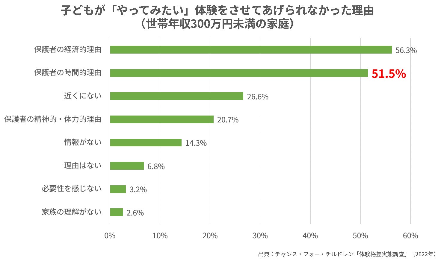 CFCが実施した『子どもの「体験格差」実態調査 最終報告書』では、「子どもの体験をさせてあげられなかった理由」として、年収300万円未満の家庭の51.5%が「保護者に時間的な余裕がないから(送迎、付き添いなど)」と回答しています。