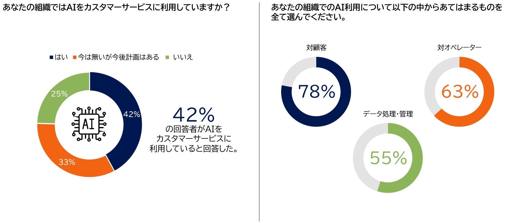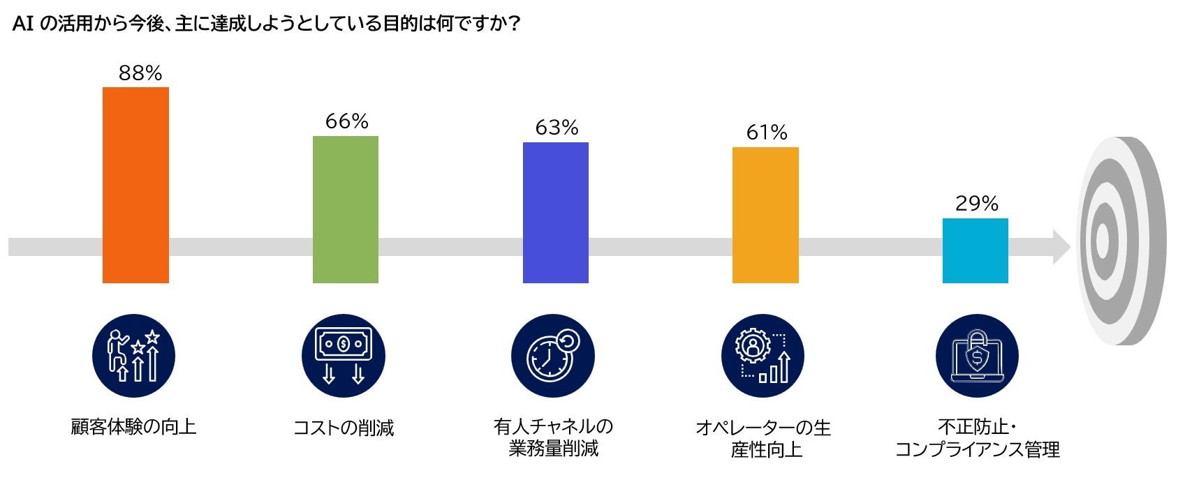 これら75%の組織に対して利用の目的について調査を実施したところ、88%が「顧客体験向上」と回答をし、直接顧客へ提供するサービスへのAI活用であっても、サービスを提供するオペレーターサポートのためのAI活用であっても多くの組織が顧客体験向上を目的に導入・活用を進めていることもわかりました。