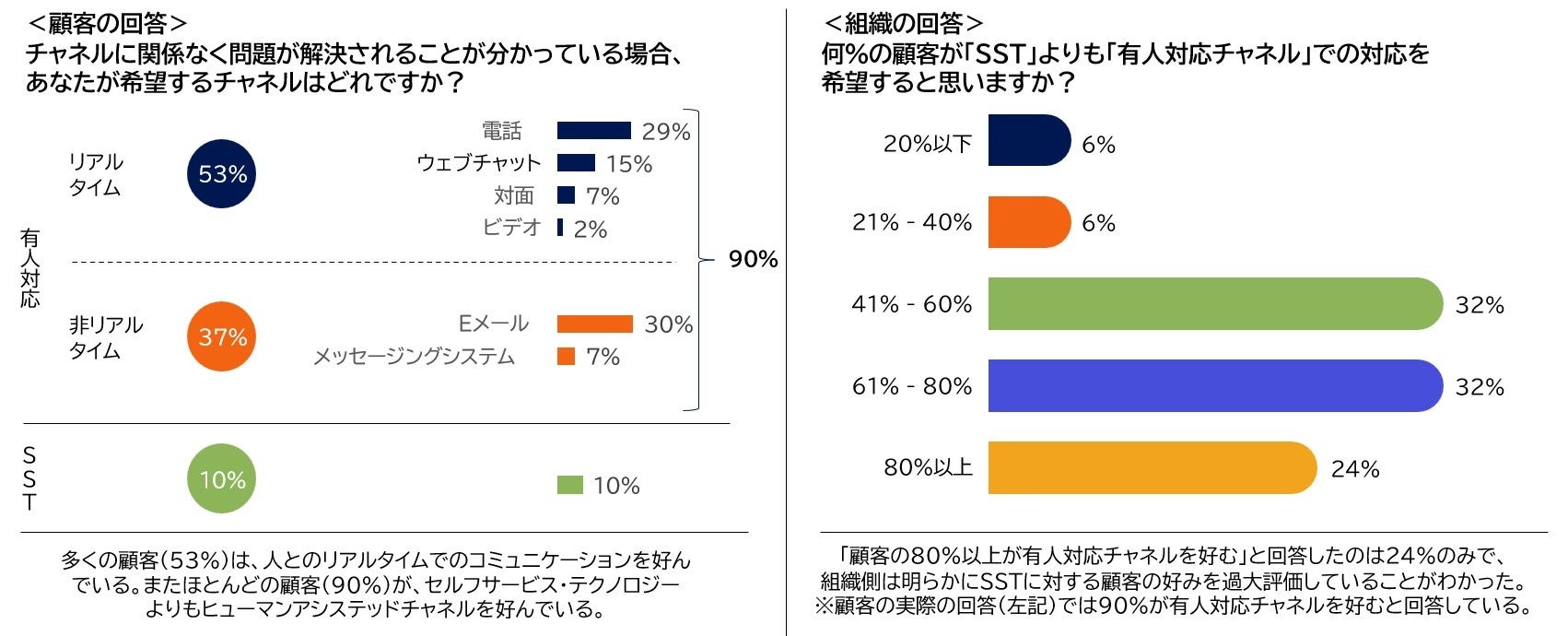 ②90%の顧客が有人対応を選ぶと回答したのに対して、近しい回答をした組織は24%のみで、約75%の組織がセルフサービステクノロジーの人気を過大評価していた