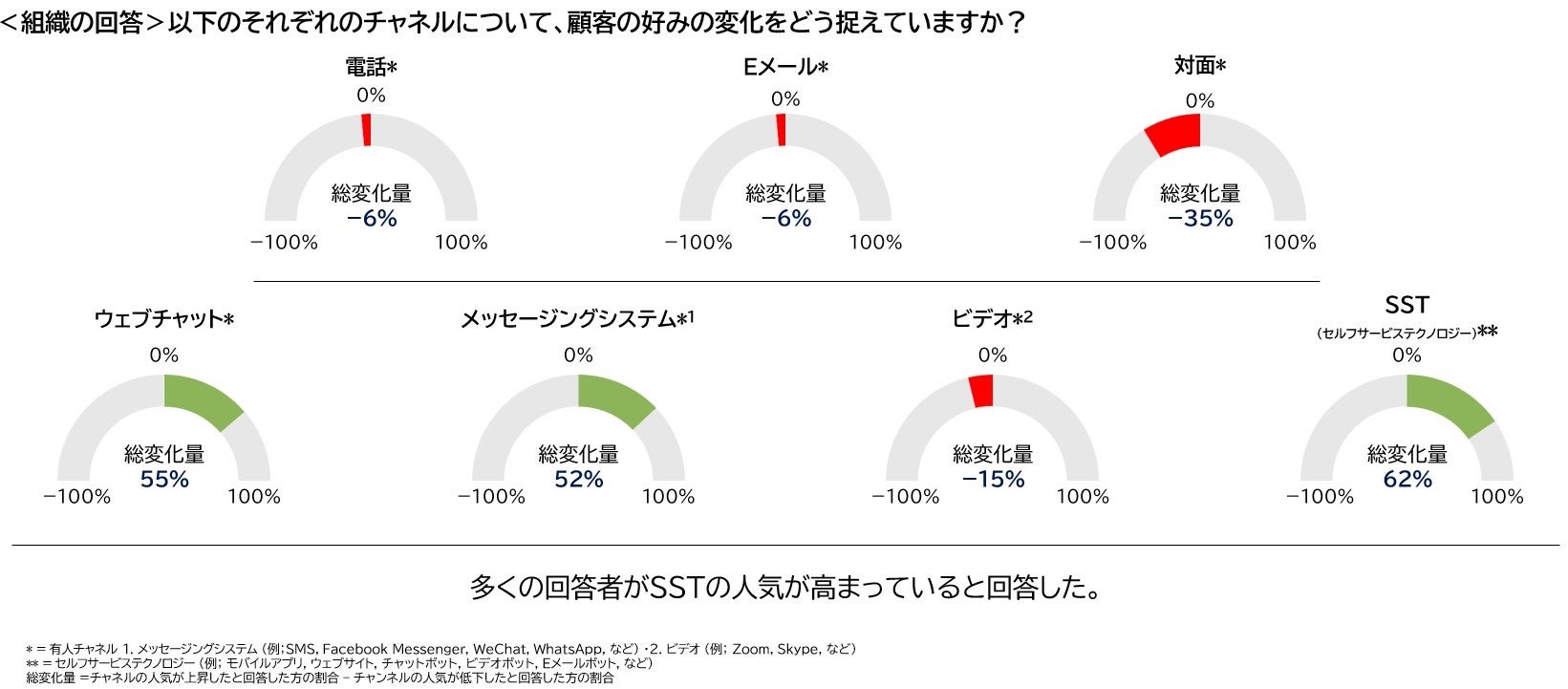 テクノロジーを活用しオペレーターなどのカスタマーサービススタッフを必要とせず顧客が自ら課題解決をできるチャネルが顧客にどれほど受け入れられているかを調査するために、はじめに組織へSSTを含む様々なチャネルの直近の好みの変化について調査を行いました。