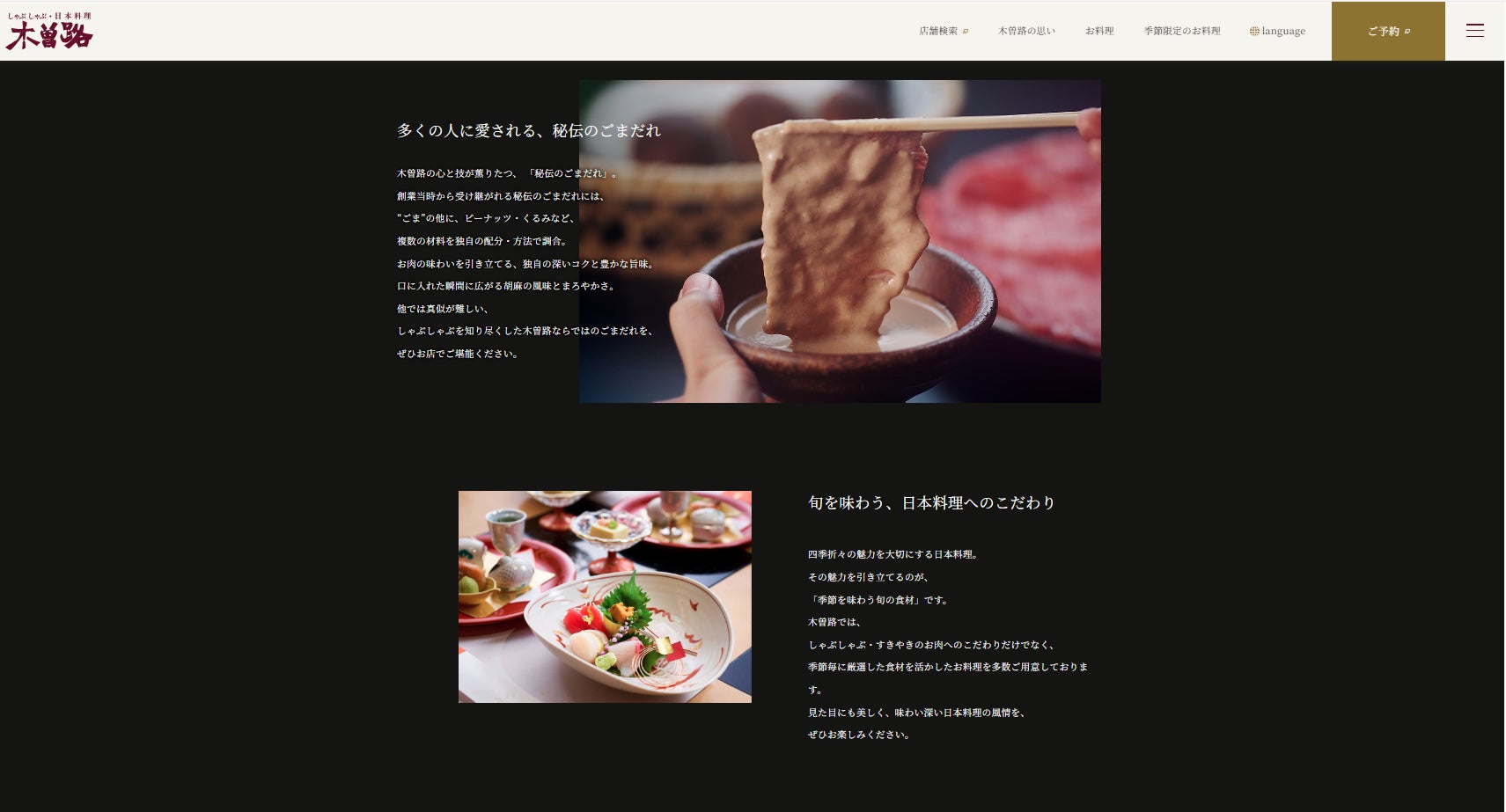 しゃぶしゃぶ・日本料理、焼肉、和食レストラン、居酒屋など全国191店舗を展開する、株式会社木曽路(本社:名古屋市昭和区/代表取締役会長兼社長:吉江源之)は、ホームページをこの度新たにリニューアルしました。「よろこびの食文化の創造」を理念として掲げる当社の更なる成長とブランド価値向上に向けた重要な一歩となるウェブサイトのリニューアルです。