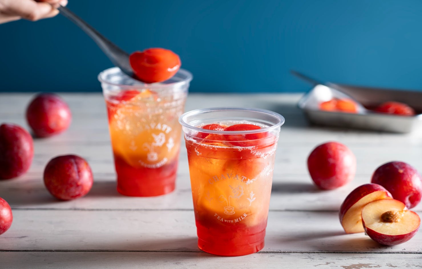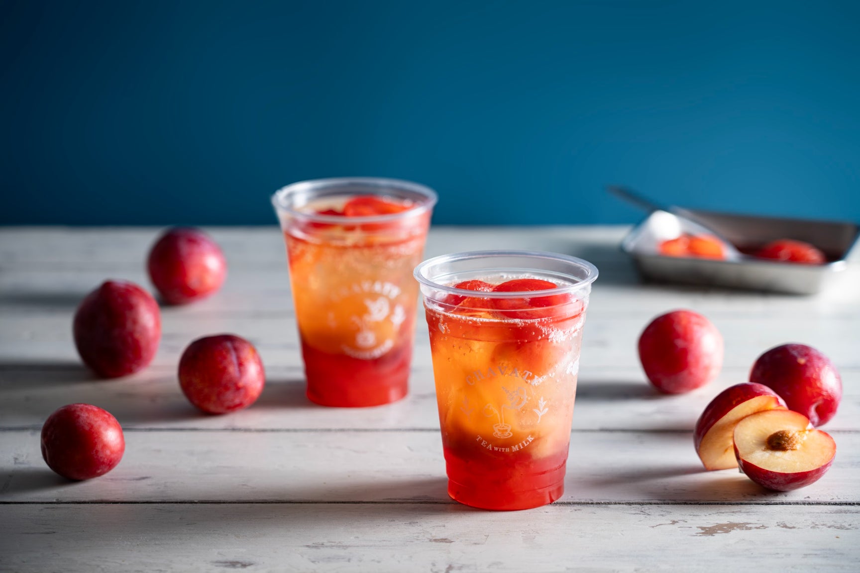信州須坂で太陽の恵をたっぷり浴びて育てられた、プラム「太陽」。濃い紅色につやめき丸々として、香りのよい完熟プラムは、しっかりと甘くほのかな酸味が広がるジューシーな味わいが魅力。豊富な果汁と強い甘さを生かした自家製のコンポートに、クオリティーシーズン・ウバの華やかな香りを合わせて爽やかなプラムティーソーダにしました。太陽プラムのコンポートを丸ごと浮かべた、果実感たっぷりのティーソーダです。