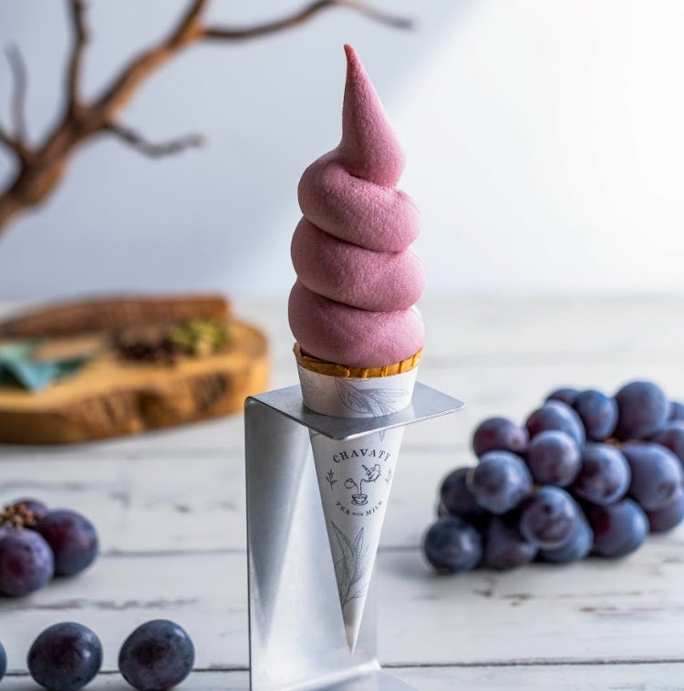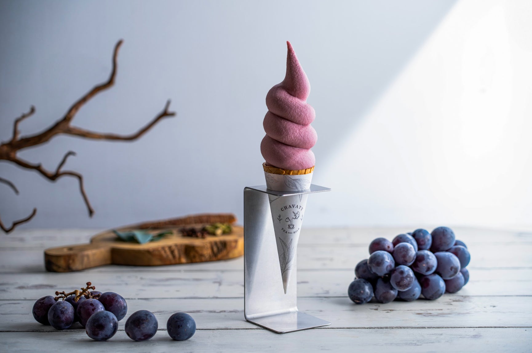 果実や茶葉など素材本来の香りや味わいを堪能する、CHAVATYの季節限定ソフトクリームには、「山梨県産巨峰クロモジソフトクリーム」が登場いたします。