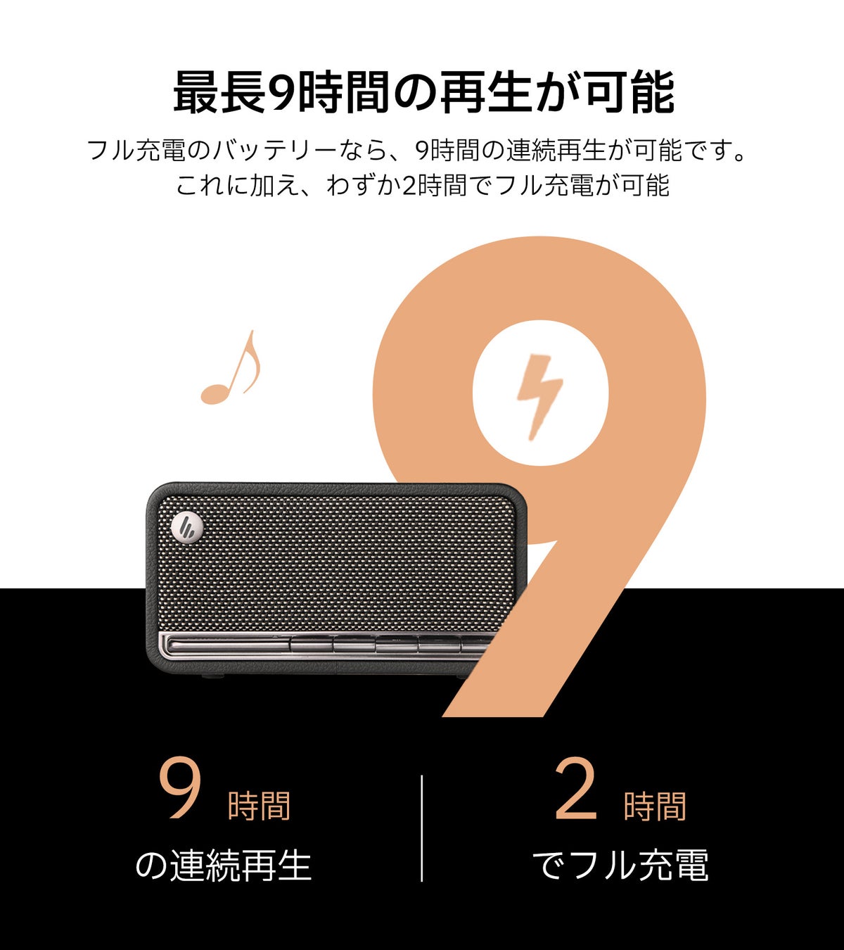 2600mAhの大容量リチウムイオンバッテリーを内蔵しており、一度のフル充電で最大10時間の連続再生が可能です。この長時間バッテリーライフにより、自宅はもちろん、アウトドアでの使用や、友人との集まりなど、さまざまなシチュエーションで気軽に持ち運び、お気に入りの音楽をどこでも楽しむことができます。