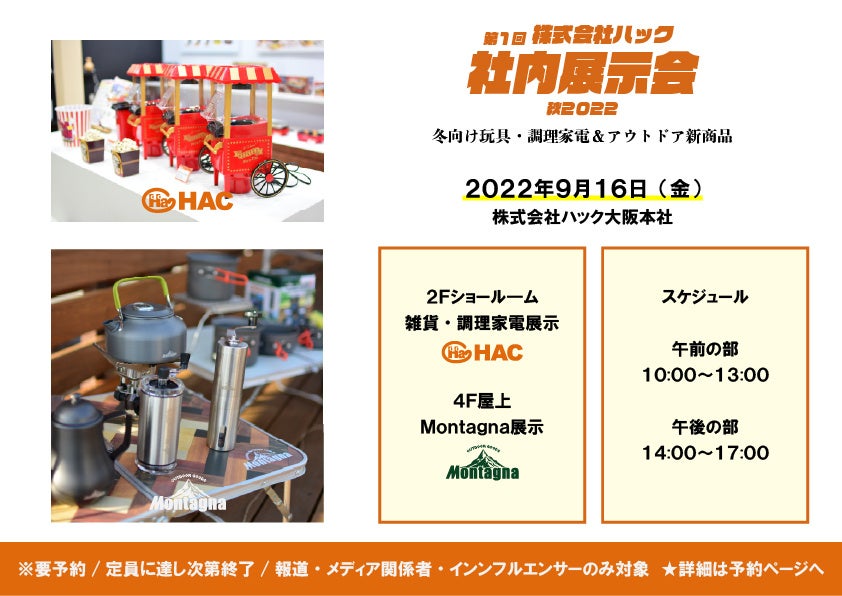 株式会社ハック(本社:大阪府東大阪市、代表取締役:有山哲也)は、2022年9月16日、株式会社ハック(大阪本社)にて報道・メディア関係者を対象に'22-23年新商品に関する社内展示会を実施致します。2022年秋冬向け雑貨・玩具など新商品などの展示・公開、2023年アウトドア用品(Montagna)の新商品などの展示・公開を行います。