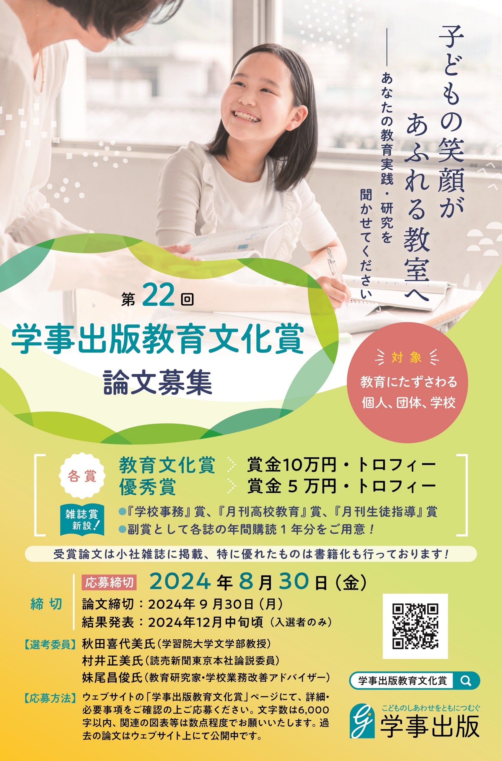 【子どもの笑顔があふれる教室へーーあなたの教育実践・研究を聞かせてください】第22回「学事出版教育文化賞」論文募集開始!