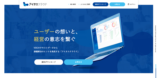「アイタスクラウド」は最先端の自然言語処理技術を用いた文章解析AI「アイタス」をエンジンとするデータ解析ダッシュボード。VOCを可視化するだけでなく、独自のフレームワークにより優先課題を明らかにすることで課題解決のヒントを見つけ、打ち手に繋げることができる業務支援ツールです。