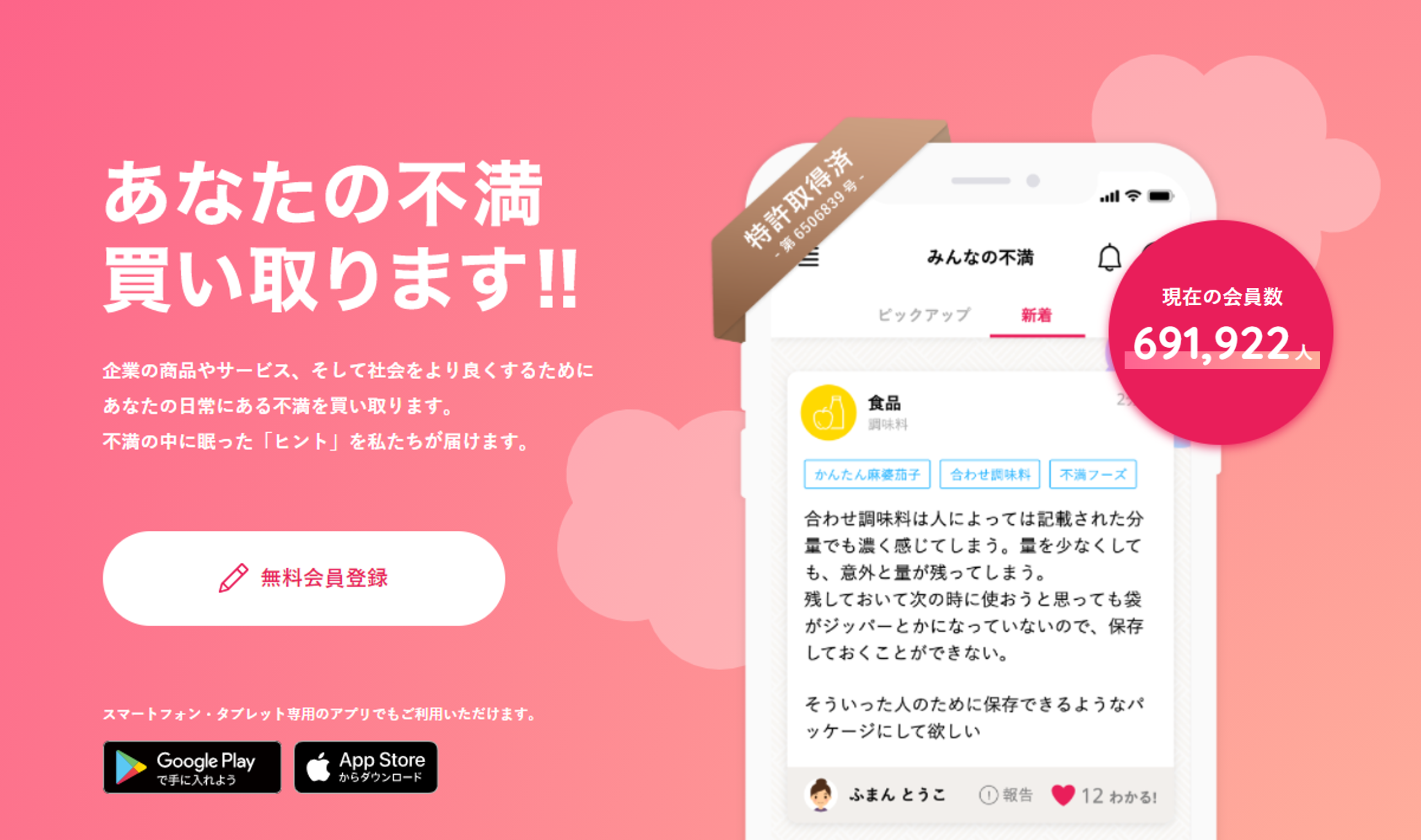 不満買取センターは、「企業の商品やサービス、そして社会をより良くするために、あなたの不満を買い取ります。あなたの不満の中に眠った”ヒント”を私たちが企業や社会に届けます」をコンセプトに、2015年3月18日からサービス開始をしております。Webサービス及びスマートフォンアプリを通して生活者からの不満の声を収集しており、現在累計69万人以上の会員から、累計3,000万件以上の不満を買い取っています。